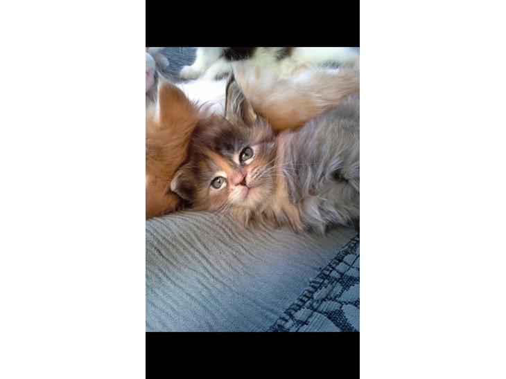 Dina er bare en fantastisk hengiven og kælen mco pige! Hun har et fantastisk temperament! Hun spinder højt, og kaster sig bare om på ryggen for at blive nusset. :)