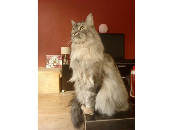 Cocco er en Tabby et eller andet silver (skal lige finde hendes stamtavle hehe) Hun er stor og høj. Hun går til mine knæ. så det vel ca. en halv meter? puha ved ikke hvad jeg skal skrive'+