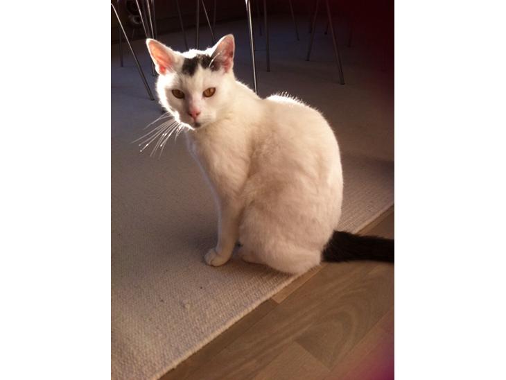 Hun er den mest dejlige, søde og rolige kat jeg kender. Hun er hvid og har en sort plet ved øret og en sort hale. Hun elsker at blive kælet.