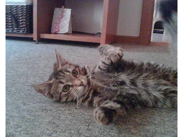 Liva er brunsstribet og meget lille. Hvilket nok skyldes hendes hårde start på livet, eftersom dem der havde hende som killing prøvede at drukne hende! Heldigvis blev hun reddet, sammen med hendes søskende, af en bamhjertig pige, som afleverede hende på kattehjemmet, hvor jeg så købte hende. Så hun har fortjent at bo ved os, vi forkæler nemlig vores katte, de skal ha det bedste. Nå men tilbage til Liva. Hun er altid glad, men kan sende de mest "sølle" blikke til en :o) det er så sødt!
