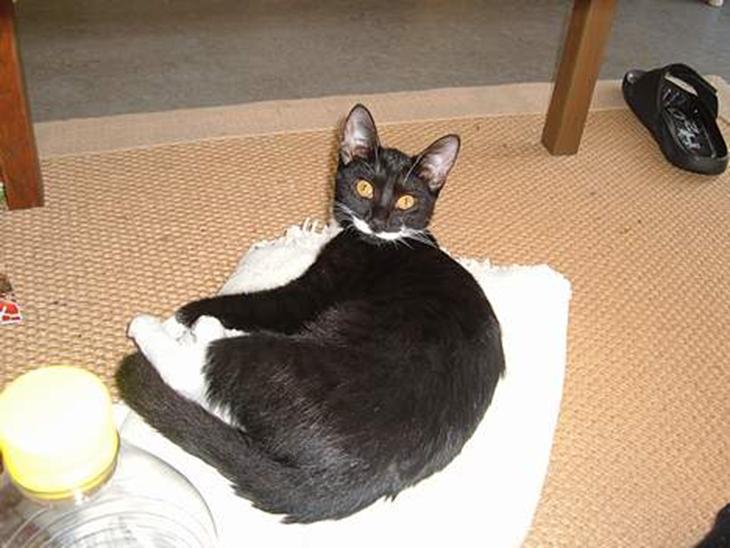 Hun er en lille frækkert på godt og vel 1 år og et par måneder. Hun er sort med hvide poter, lidt hvis på maven og så har hun et lille hvidt mælkeskæg. hun har gulbrune øjne. Hun er meget lille synes jeg, selvom hun har en god appetit.. Jeg vil skyde på at hun vejer omkring 2,5 kg. Hun er altid sprængfyldt med energi og hun kan godt drive én til vandvid nogle gange. Især når hun ødelægger mine ting.. hehe..