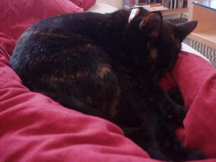Hun er en trefarvet, meget dejlig mis. Hun er speciel på en dejlig måde. Hun er helt sikkert mors kat.Hun elsker at undersøge ting, og sove i solen er det bedste. Hun er forkælet.