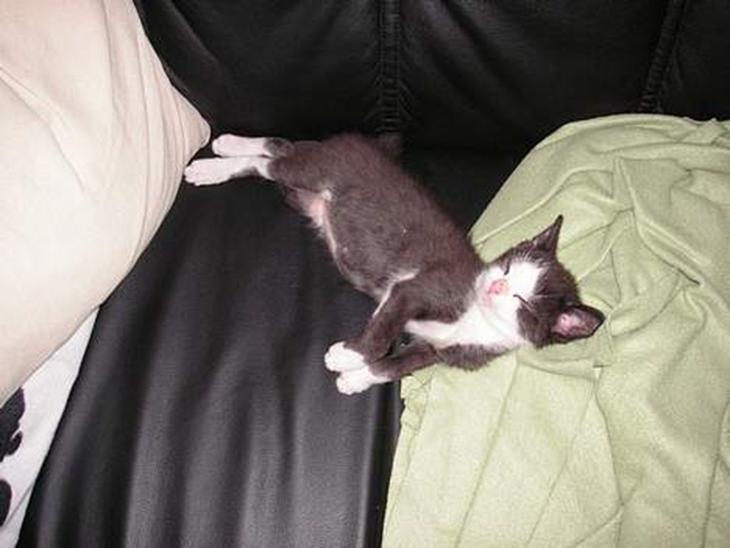 Han er en charmetrold. Han er hvid på maven og mørkegrå på ryggen og har sorte øre. Jeg tror han har lidt siameser over sig, for hvis man ser på hans store spidse øre og de skrå øjne og den tynde hale, plus at hans pels er heller ikke så tyk, men han er nok mest huskat... Han er kun halv størrelse af hvad han skulle være når han er 12 uger, men det var for at hans mor ikke havde nok mælk, så han måtte have mælkeafstatning med en sprøjte, så jeg tror ikke han har optaget alt det næring han havde brug for. Han fylder ikke meget mere end en god håndfuld. Når han er ved at være træt, så kravlef han op til os og vil putte i sofaen, men ikke ved siden af os eller i skødet, nej han kravler helt op og ligger sig op af vores hals, han er lidt af en trykhedsnakoman.